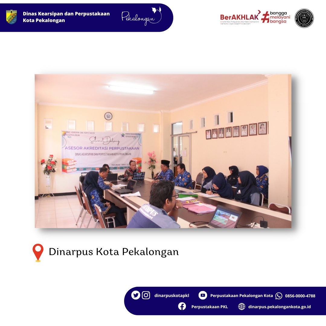 Visitasi Assessor Perpustakaan Nasional dalam Rangka Akreditasi Perpustakaan oleh Tim Assessor Perpustakaan Nasional RI diwakili oleh Bapak Drs. Budi Kurniawan dan disambut langsung oleh Kepala Dinas Kearsipan Kota Pekalongan, Bapak Drs. Soeroso, M.Pd. Hasil dari penilaian Tim Assessor, Dinarpus mendapatkan nilai 83.54 dengan predikat B.