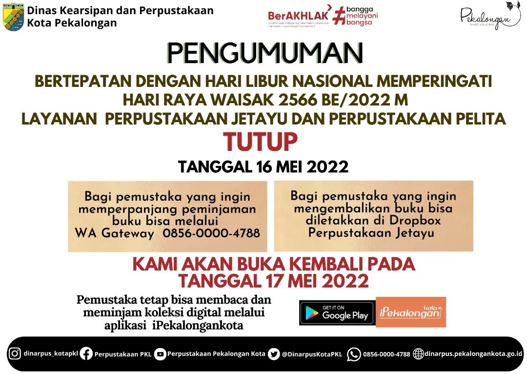 Sore ini, Admin mau kasih info nih, bertepatan dengan peringatan Hari Raya Waisak 2022/2566 BE maka Perpustakaan Daerah Kota Pekalongan tidak membuka layanan (TUTUP) pada 16 Mei 2022. Layanan akan kami buka kembali pada 17 Mei 2022.